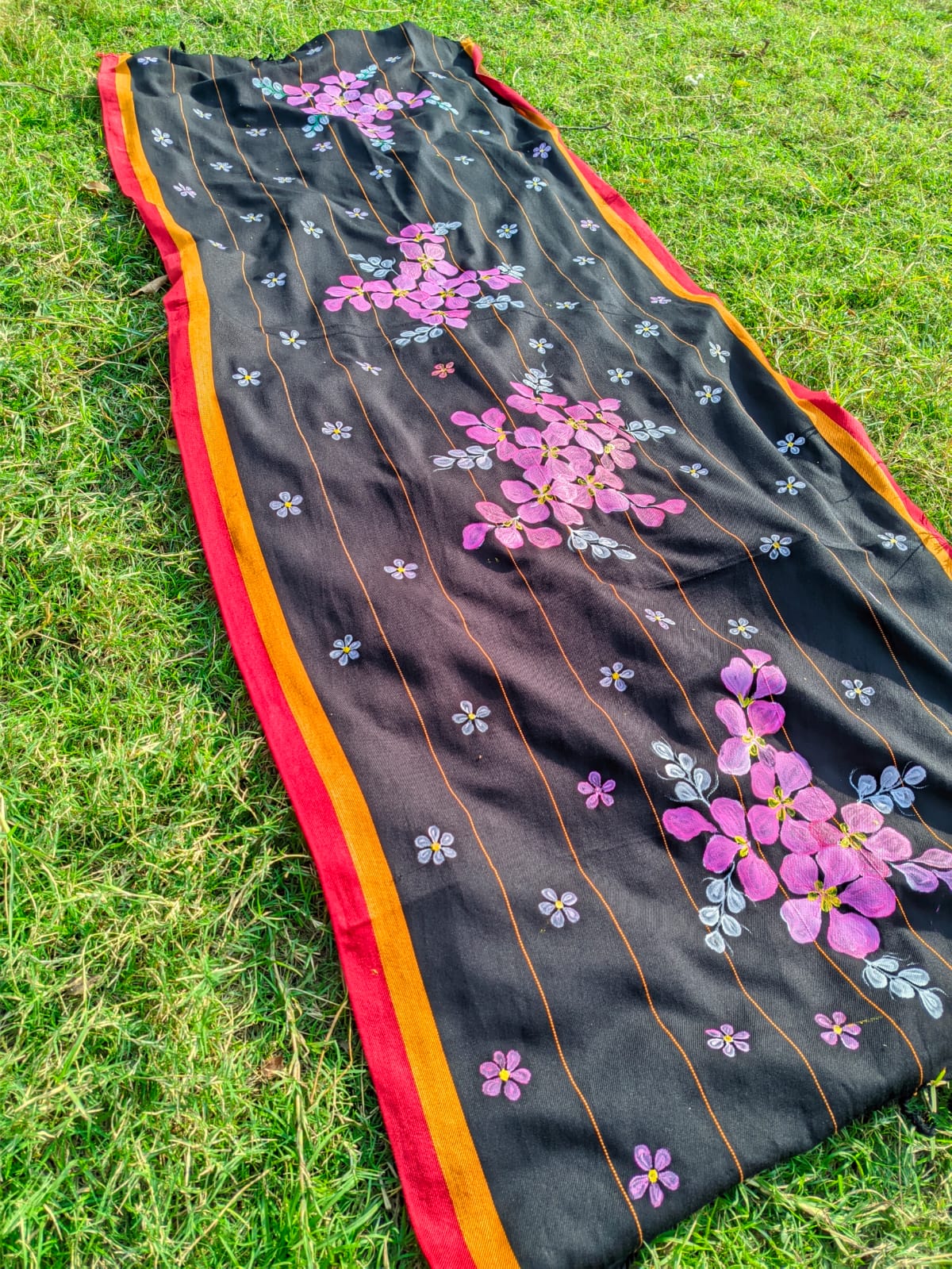 কালো ক্যানভাসে পিঙ্ক পুষ্পলতা শালটি আধুনিক রুচি ও ঐতিহ্যবাহী শিল্পের এক নিখুঁত সংমিশ্রণ। গভীর কালো রঙের উপর হাতে আঁকা পিঙ্ক ফুলের নকশা শালটিকে করেছে চোখে পড়ার মতো আকর্ষণীয় ও অভিজাত।