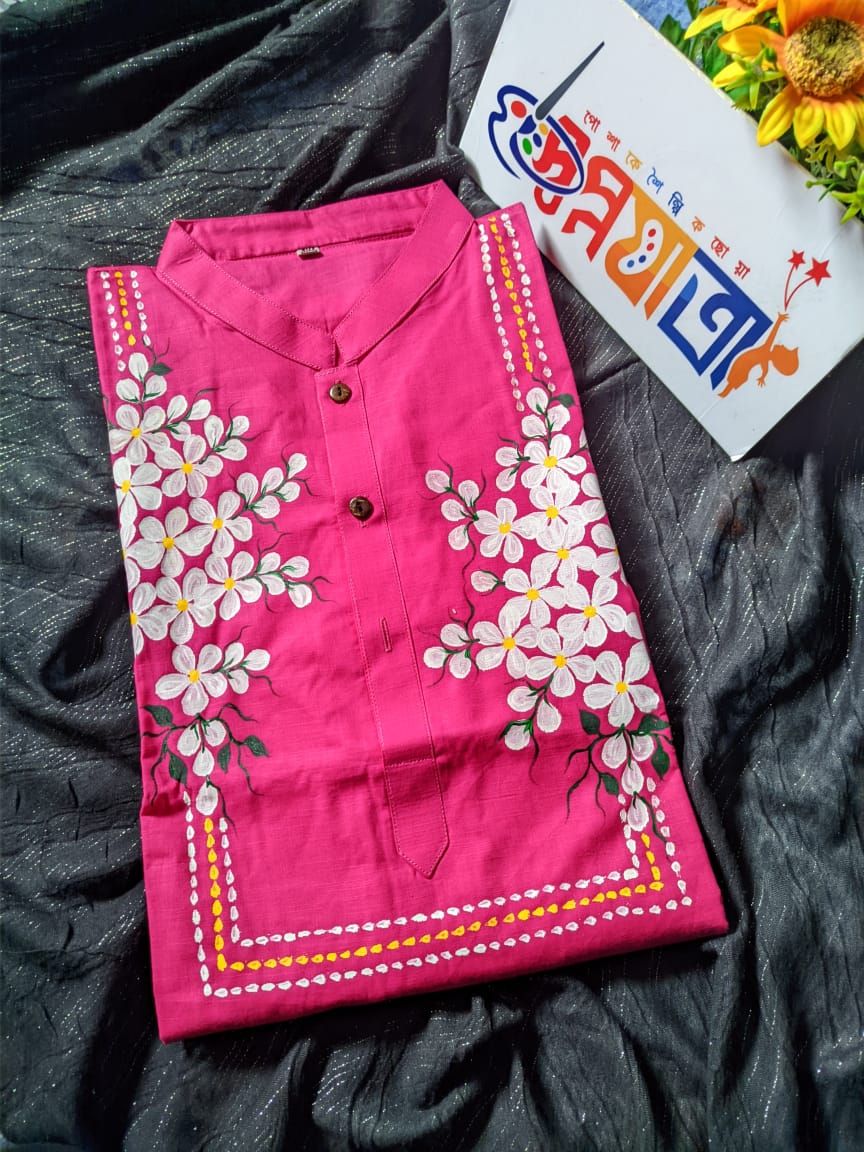 এই হ্যান্ড পেইন্টেড পাঞ্জাবিটি তৈরি করা হয়েছে প্রাণবন্ত গোলাপি রঙের প্রিমিয়াম কাপড়ে। সামনের অংশজুড়ে সাদা ফুলের শৈল্পিক নকশা এবং হলুদ ডট ডিটেইলস পাঞ্জাবিটিকে দিয়েছে একদম ফ্রেশ ও এলিগ্যান্ট লুক।