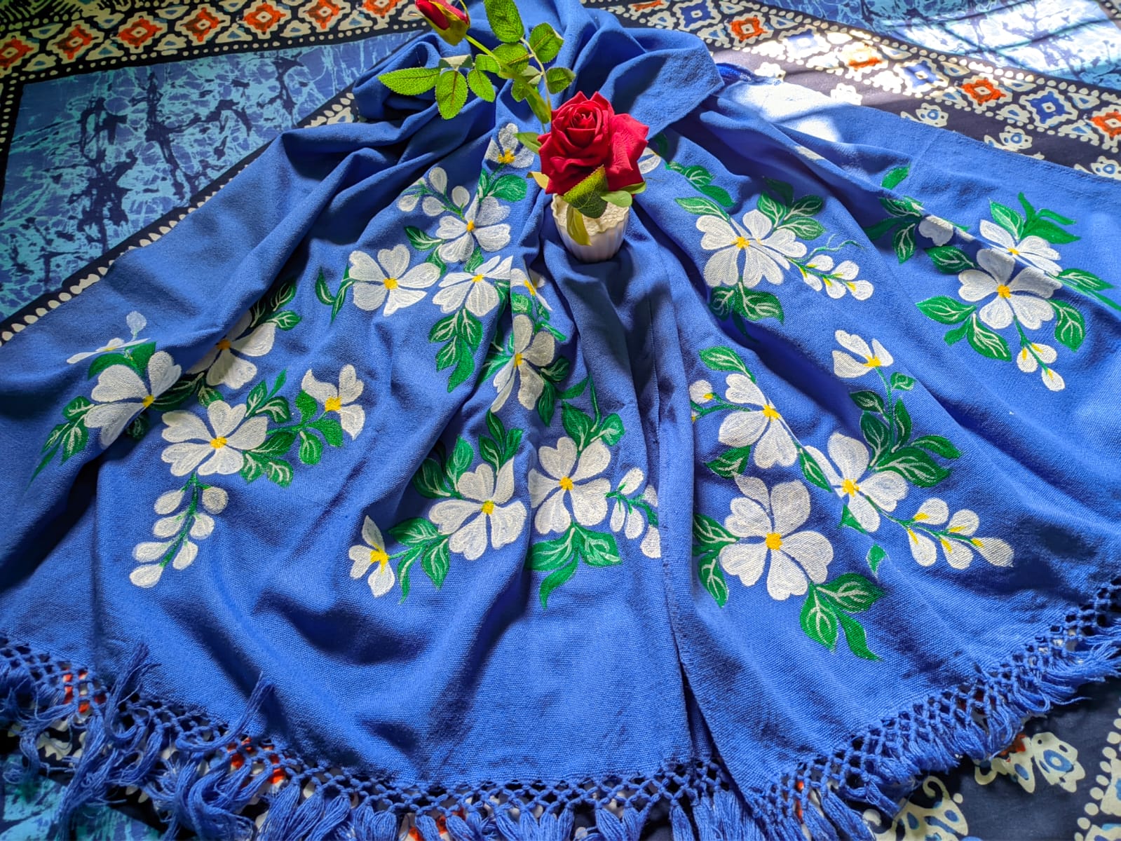 এই শালটি তৈরি করা হয়েছে নরম ও আরামদায়ক কাপড়ে। গভীর নীল রঙের উপর সাদা শেফালি ফুল ও সবুজ পাতার হ্যান্ড পেইন্টেড নকশা শালটিকে দিয়েছে এলিগ্যান্ট ও ক্লাসিক লুক। প্রতিটি শালই হাতে আঁকা হওয়ায় প্রতিটি পিস একদম ইউনিক।