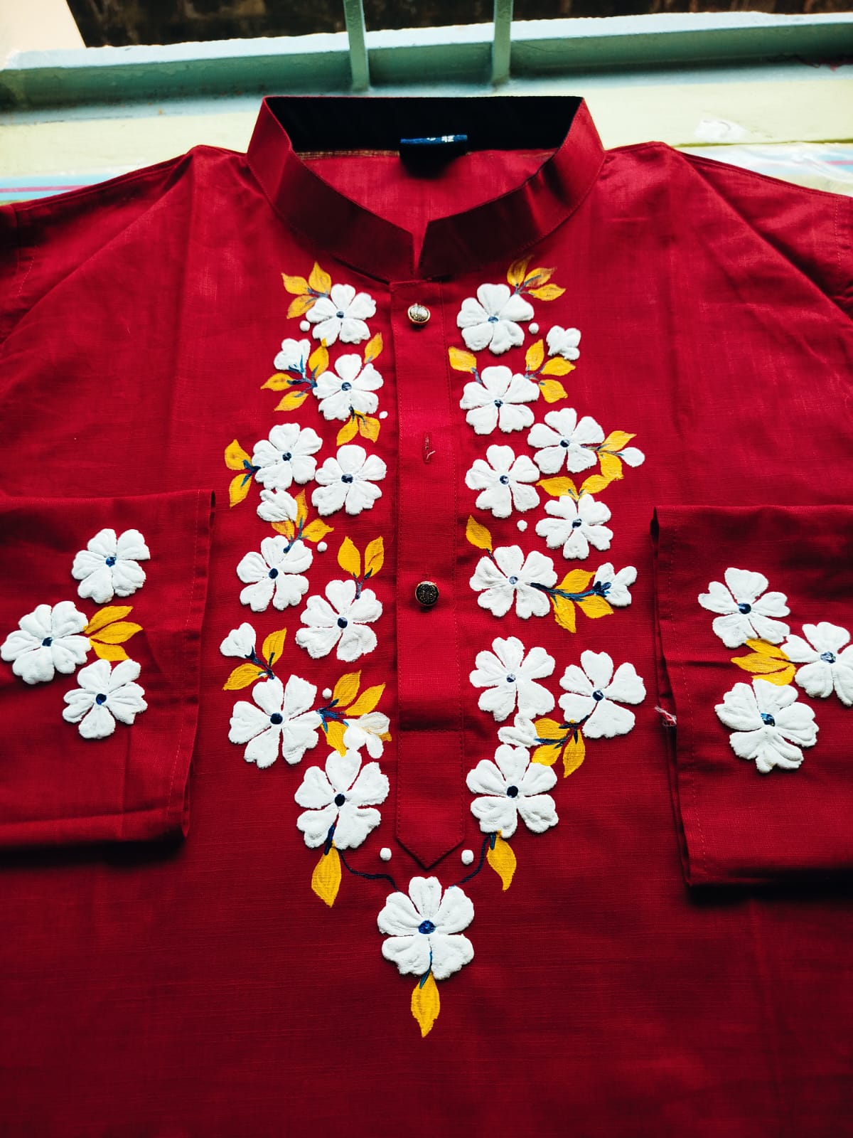 গাঢ় মেরুন রঙের উপর সাদা ফুলের হ্যান্ড পেইন্ট ডিজাইনে তৈরি এলিগ্যান্ট ও এক্সক্লুসিভ পাঞ্জাবি।