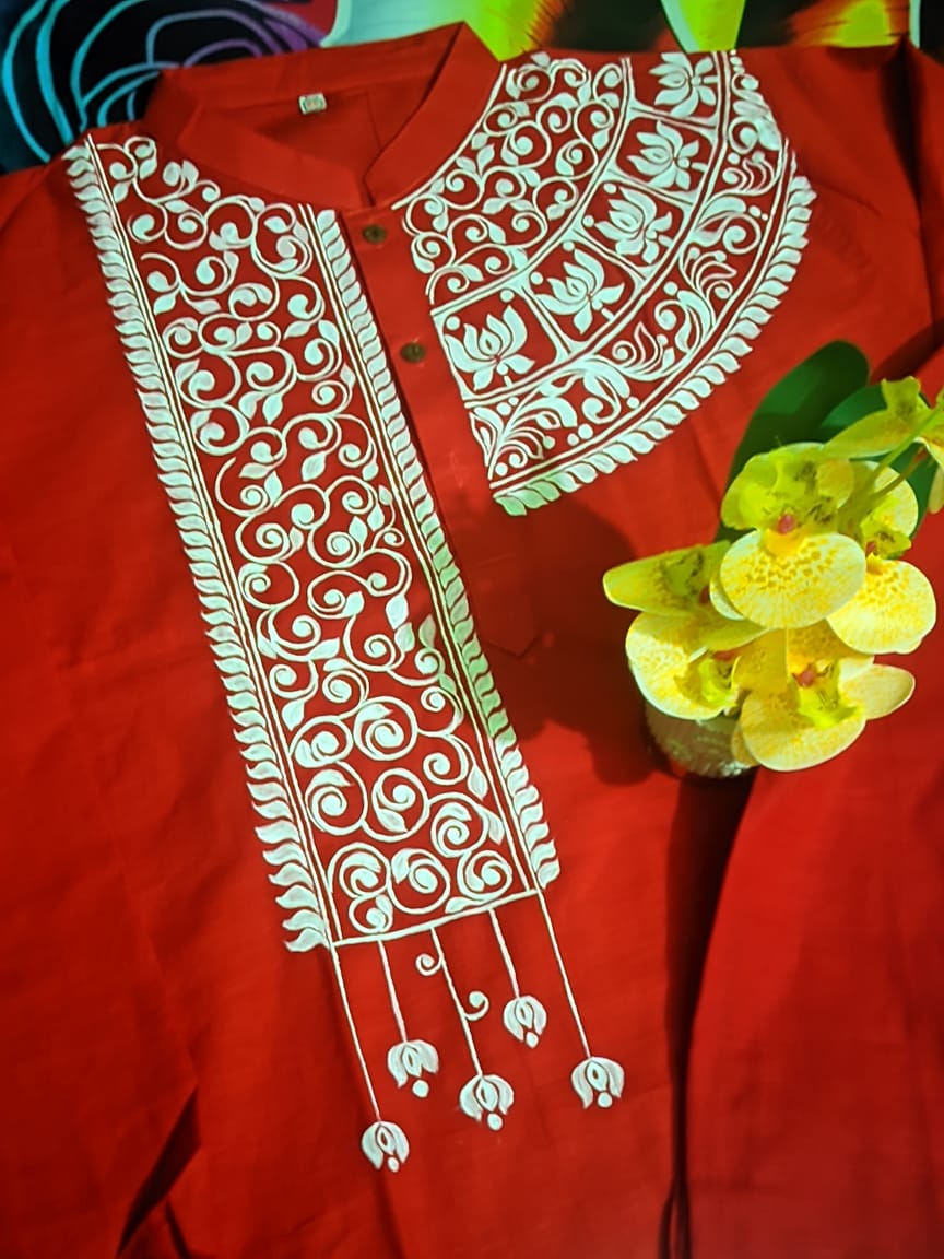 বাংলার ঐতিহ্যবাহী আলপনা শিল্প থেকে অনুপ্রাণিত এই হ্যান্ড পেইন্টেড পাঞ্জাবিটি তৈরি করা হয়েছে গভীর লাল (রক্তিম) রঙের প্রিমিয়াম ফেব্রিকের উপর। গলার চারপাশে ও বুক জুড়ে সাদা রঙের সূক্ষ্ম হাতে আঁকা নকশা পাঞ্জাবিটিকে দিয়েছে একটি রাজকীয় ও আভিজাত্যপূর্ণ উপস্থিতি।